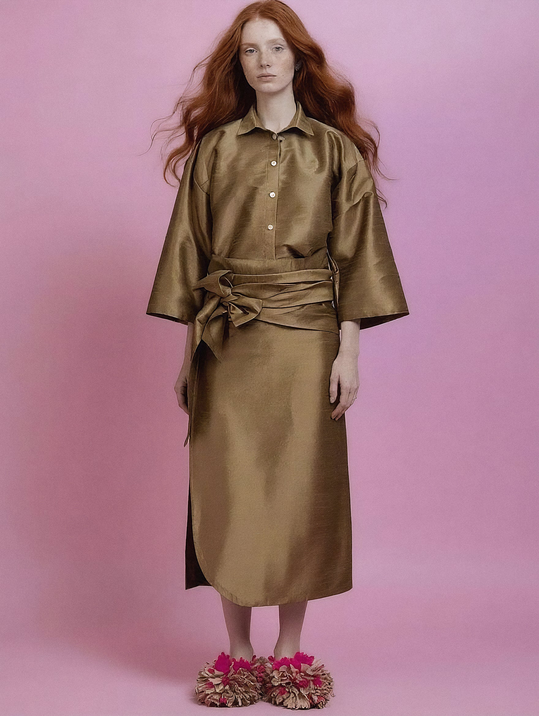 Il colore caldo e luminoso esalta la matericità della seta, rendendo il set perfetto sia per il giorno che per occasioni più ricercate, con uno styling minimal e contemporaneo.