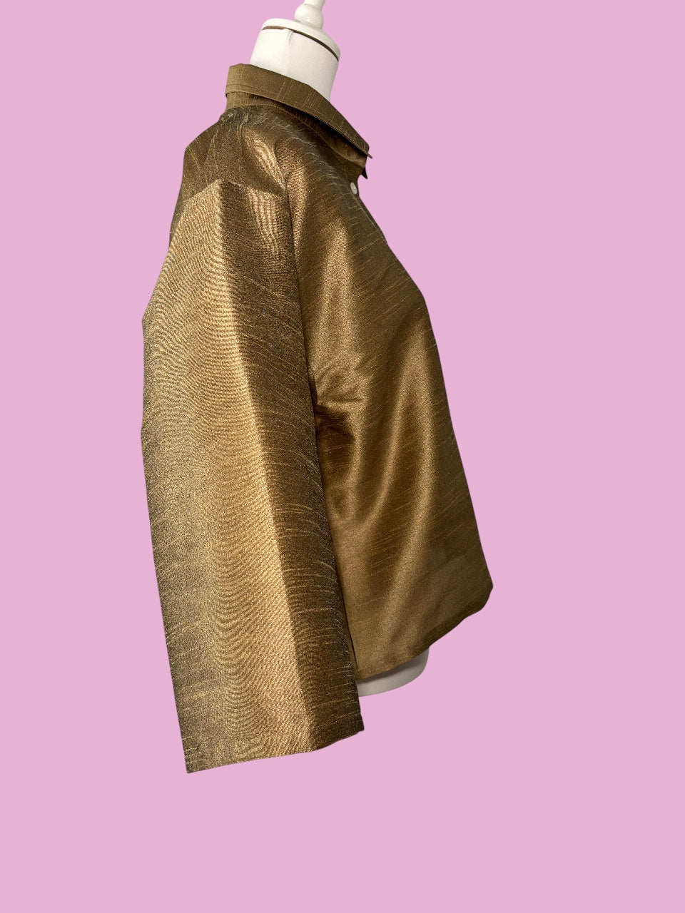 La camicia ampia in seta dupioni presenta una linea morbida e strutturata allo stesso tempo: le proporzioni generose, le maniche ampie e il taglio essenziale valorizzano la texture naturalmente irregolare del tessuto, creando un effetto luminoso e materico.