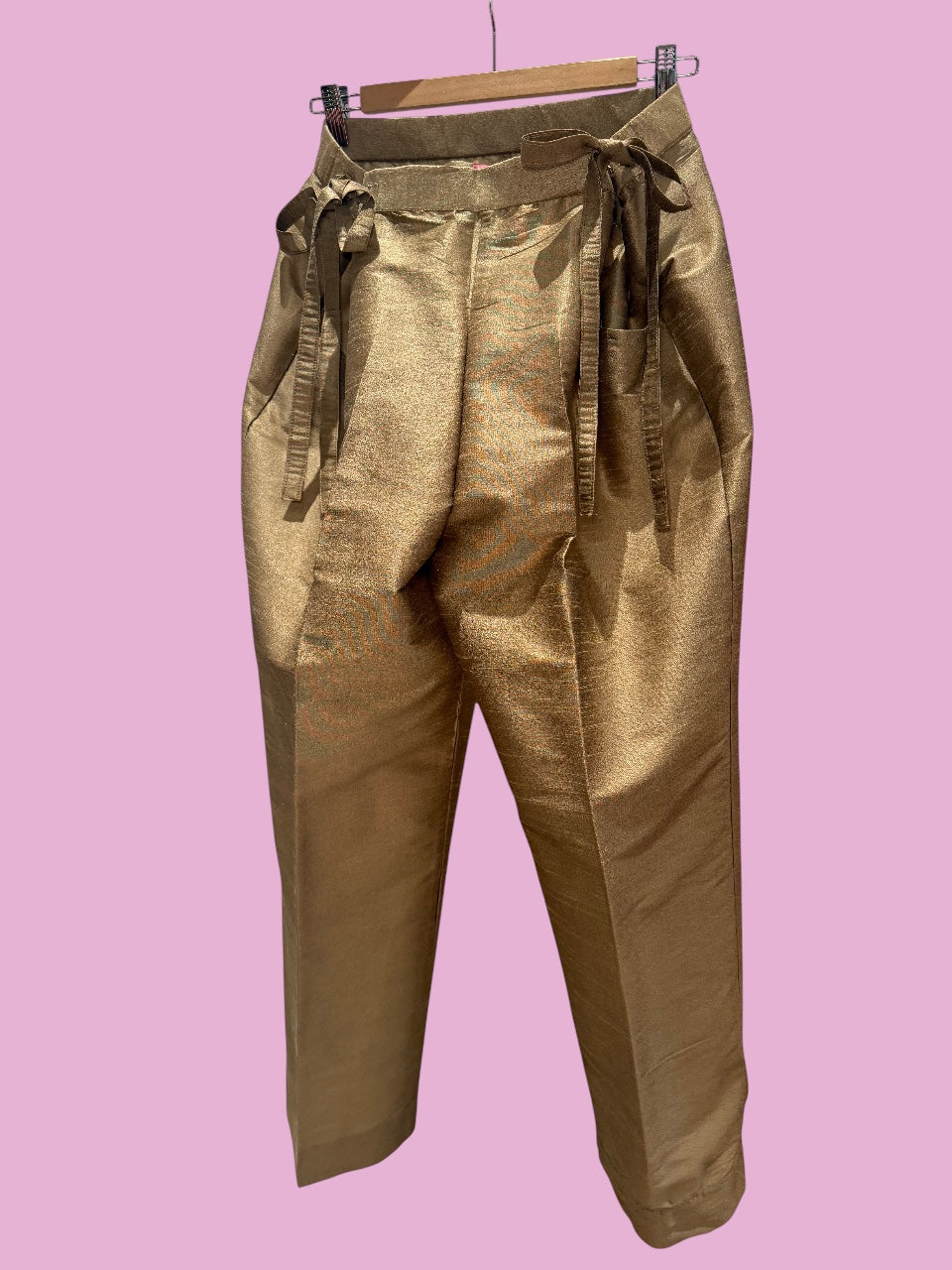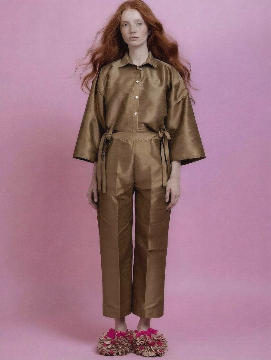 I pantaloni in seta dupioni sono progettati con una costruzione flessibile e funzionale. La vita è regolabile grazie a bottoni e lacci laterali, che permettono di stringere o allentare il capo secondo le proprie preferenze, adattandolo a diverse fisicità e modalità di indosso. Questa struttura rende il pantalone confortevole ma sempre definito, con una vestibilità personalizzabile.