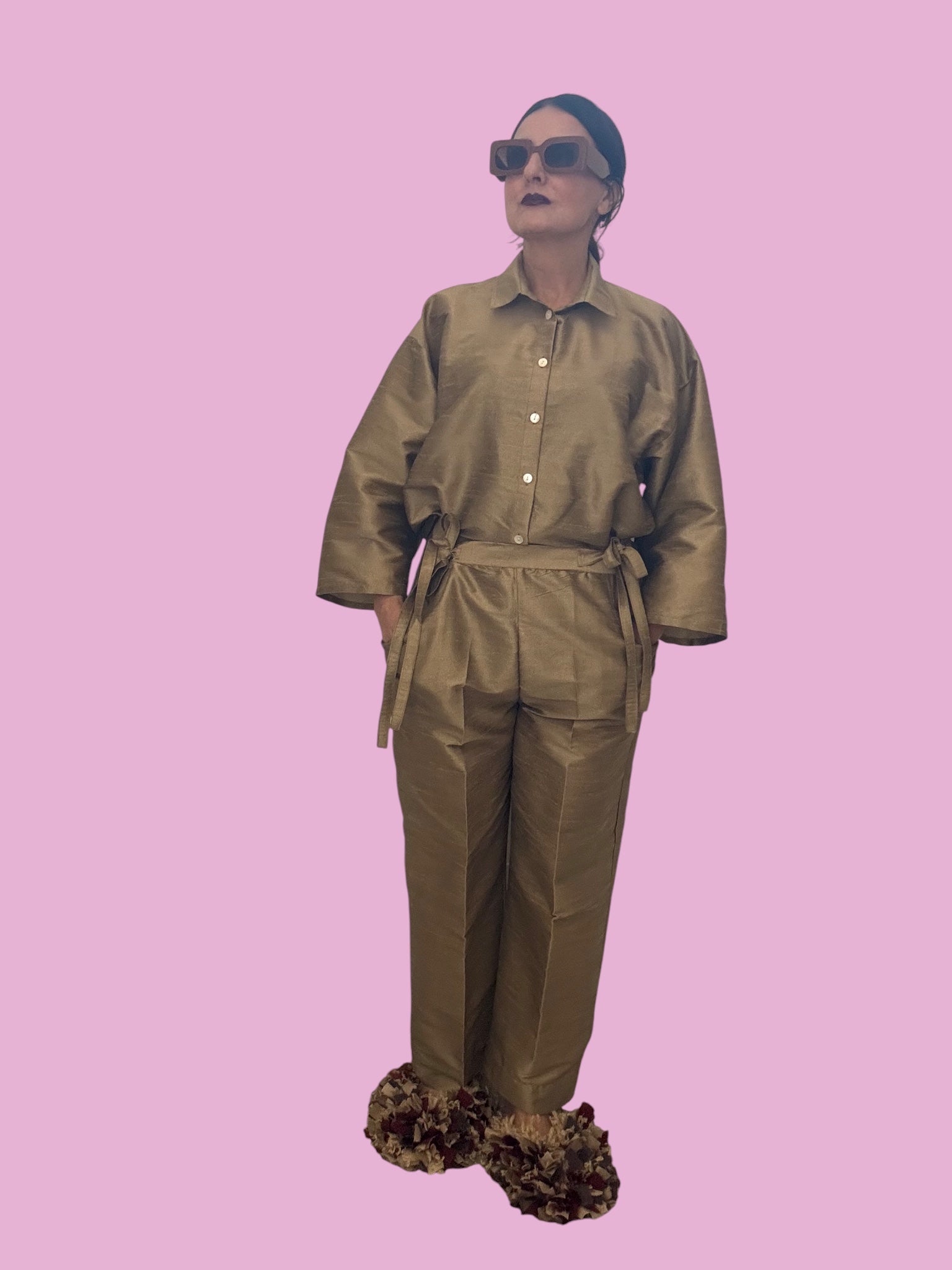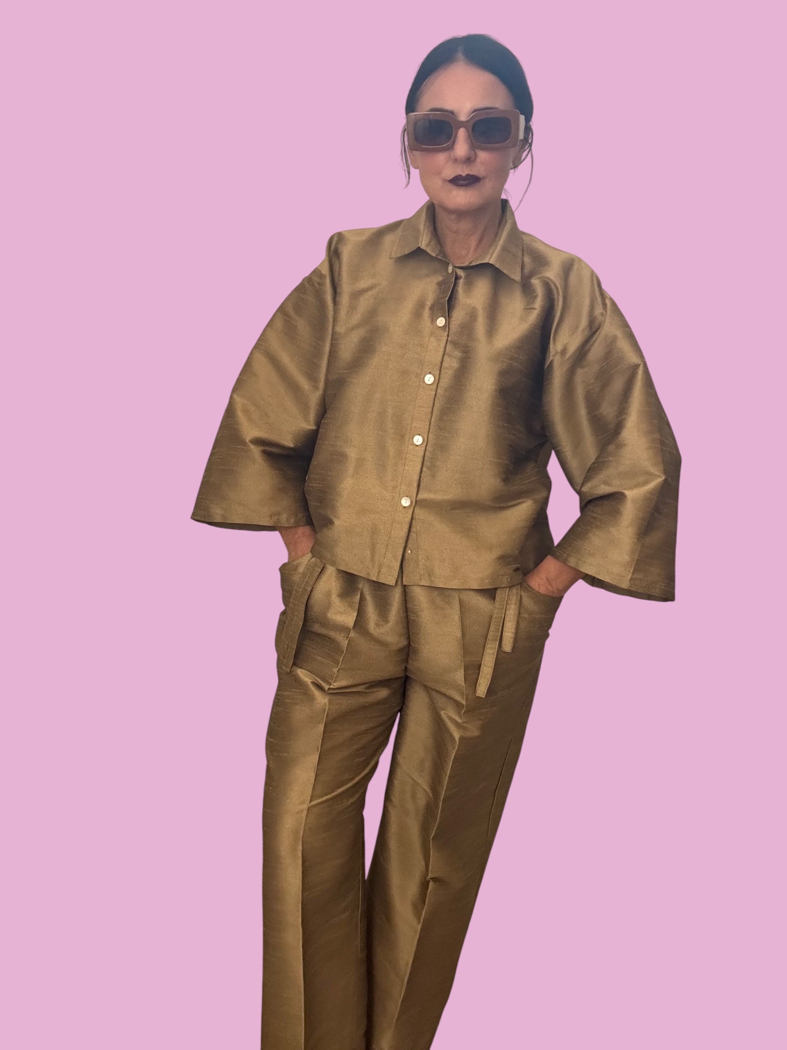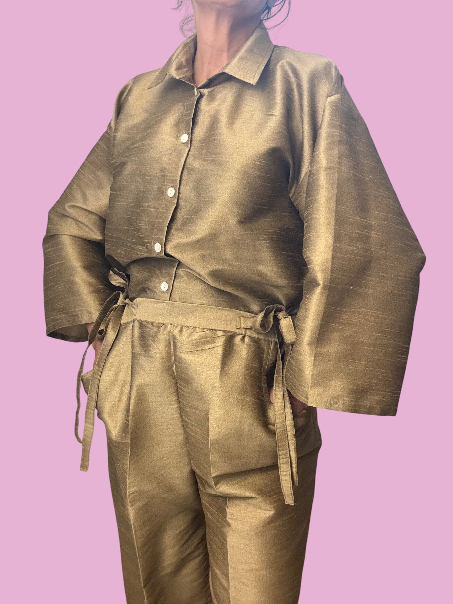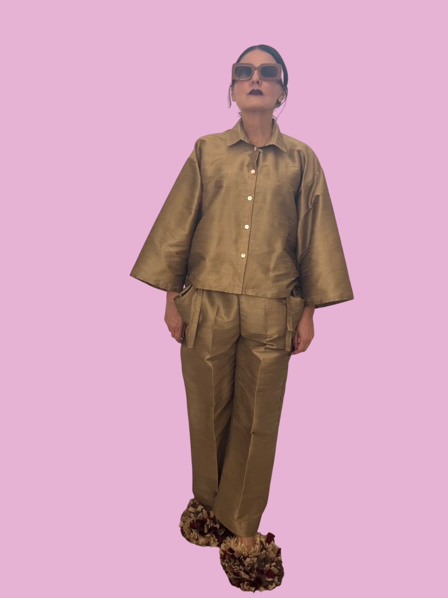 Combo camicia ampia e pantaloni regolabili in seta dupioni beige
