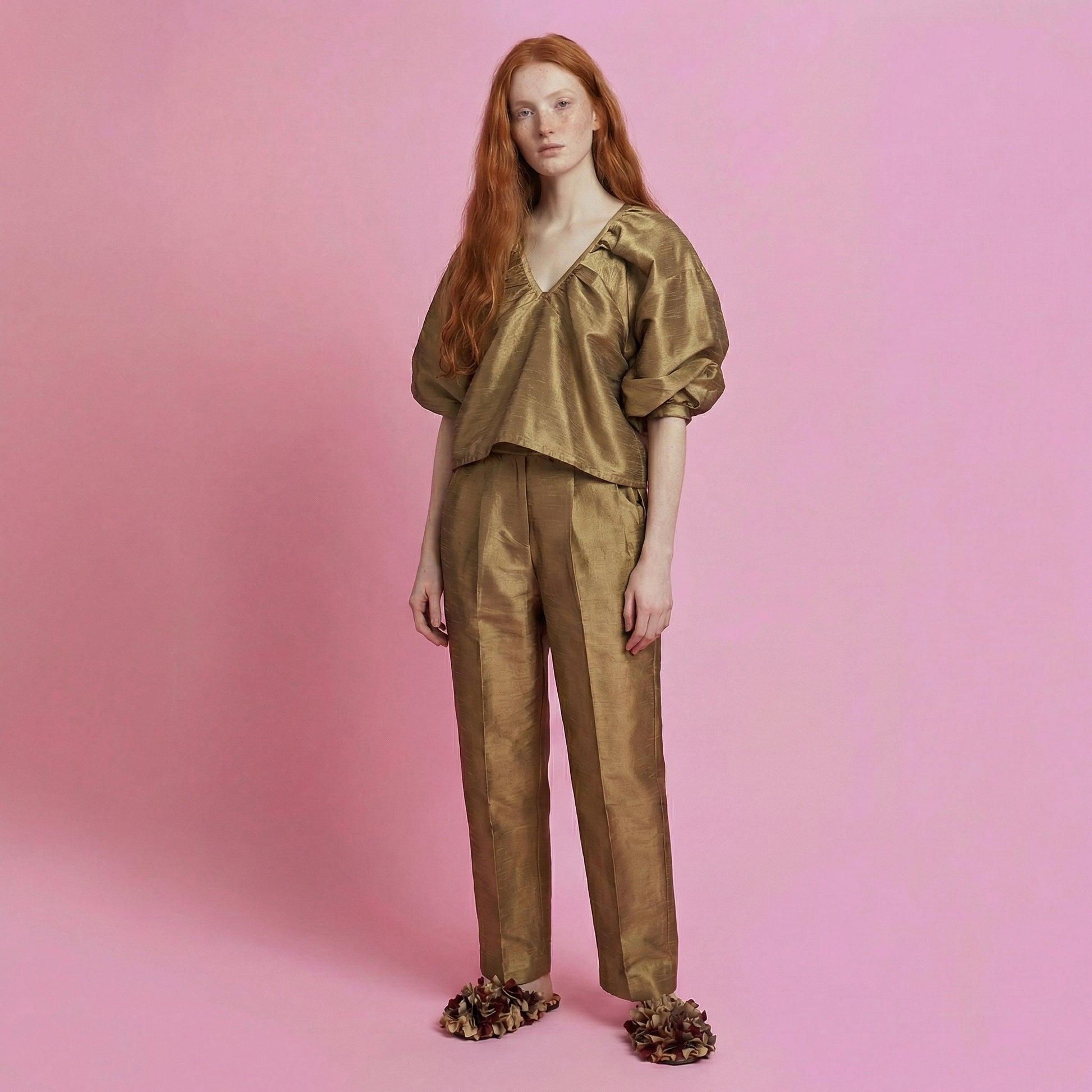 Questo top in seta dupioni è costruito attorno al concetto di volume libero: una forma morbida e scultorea che avvolge il corpo senza costringerlo. Le maniche ampie e strutturate creano una silhouette decisa ma fluida, mentre lo scollo morbido valorizza la luminosità naturale del tessuto.
