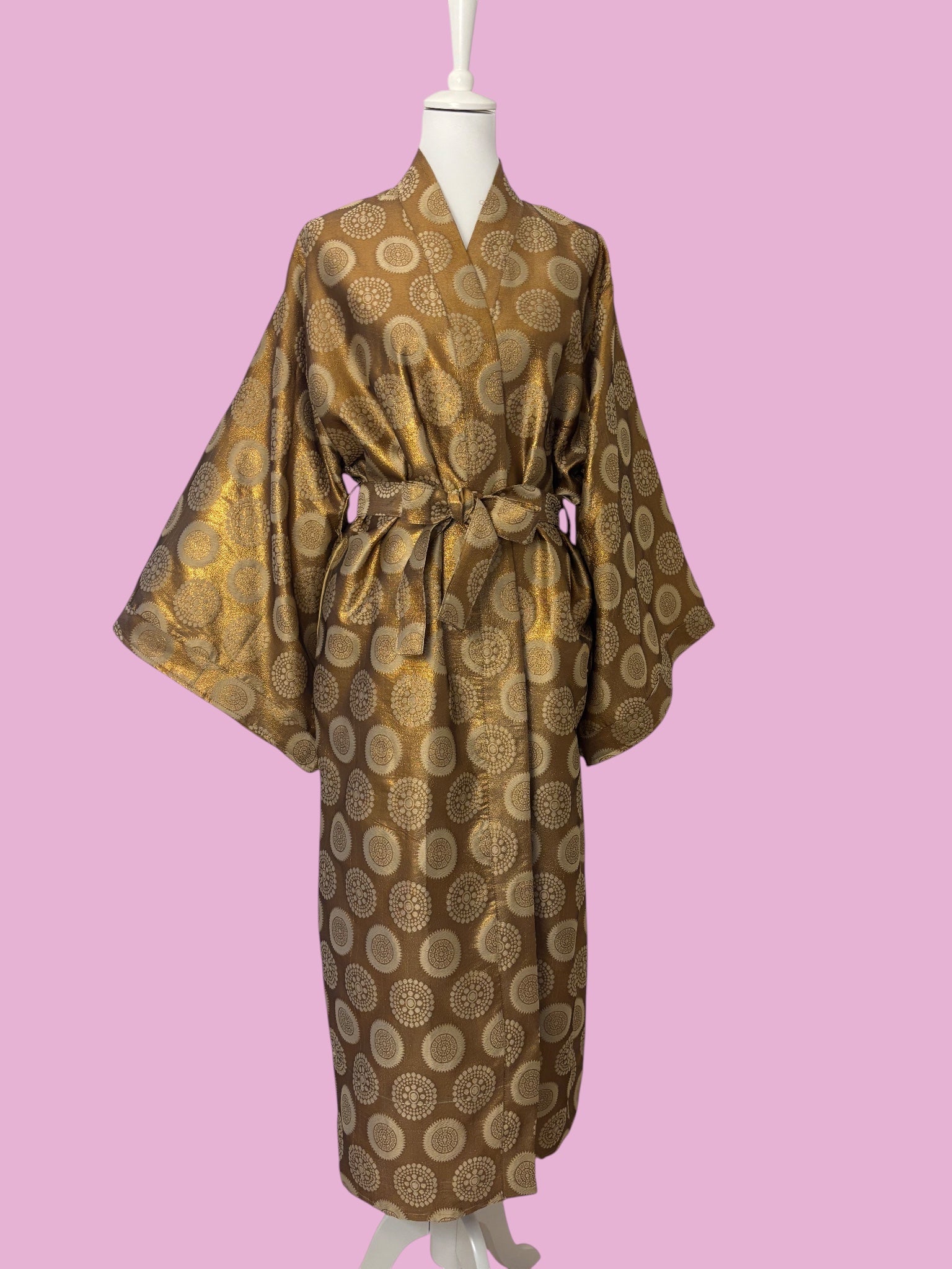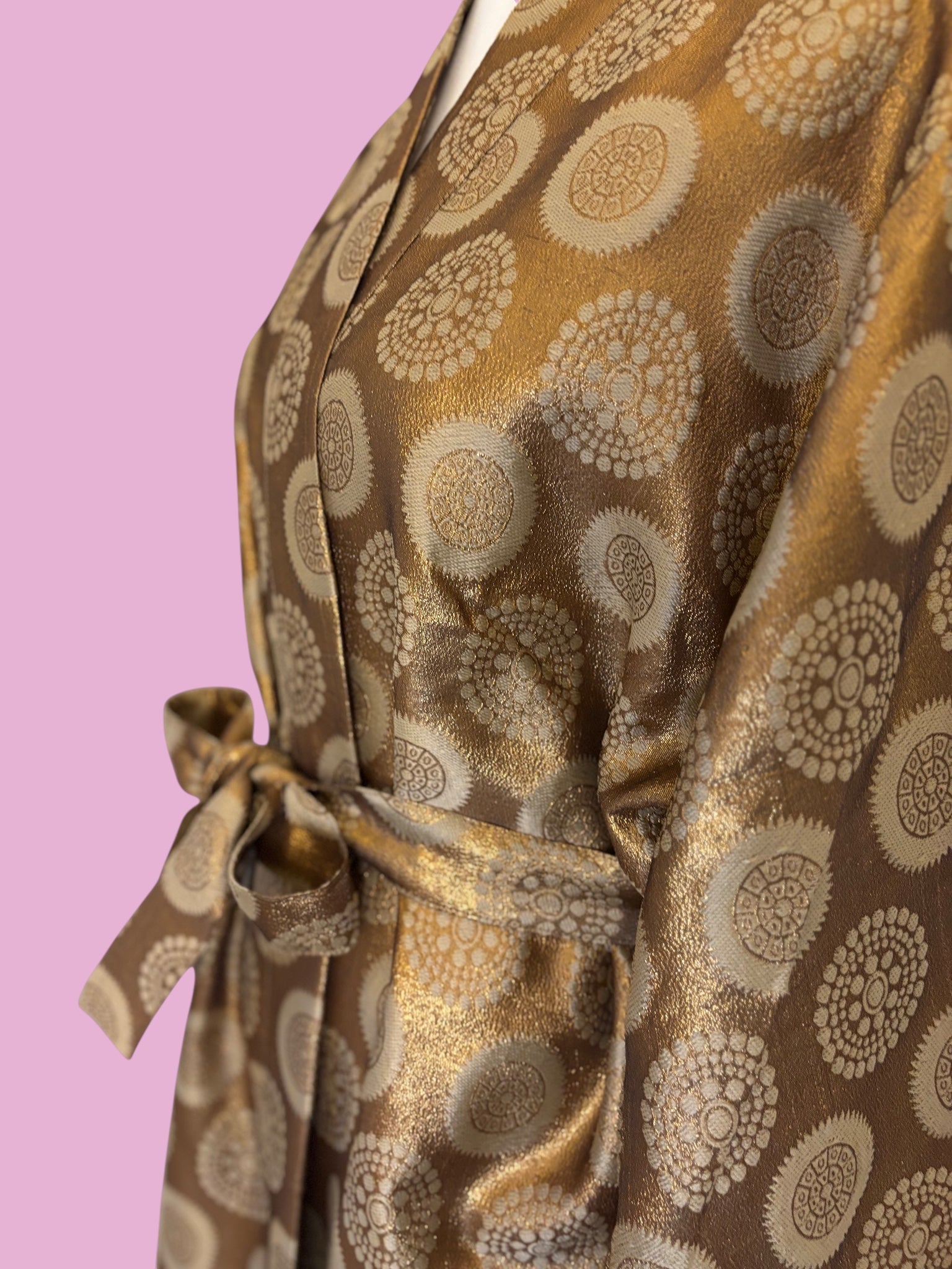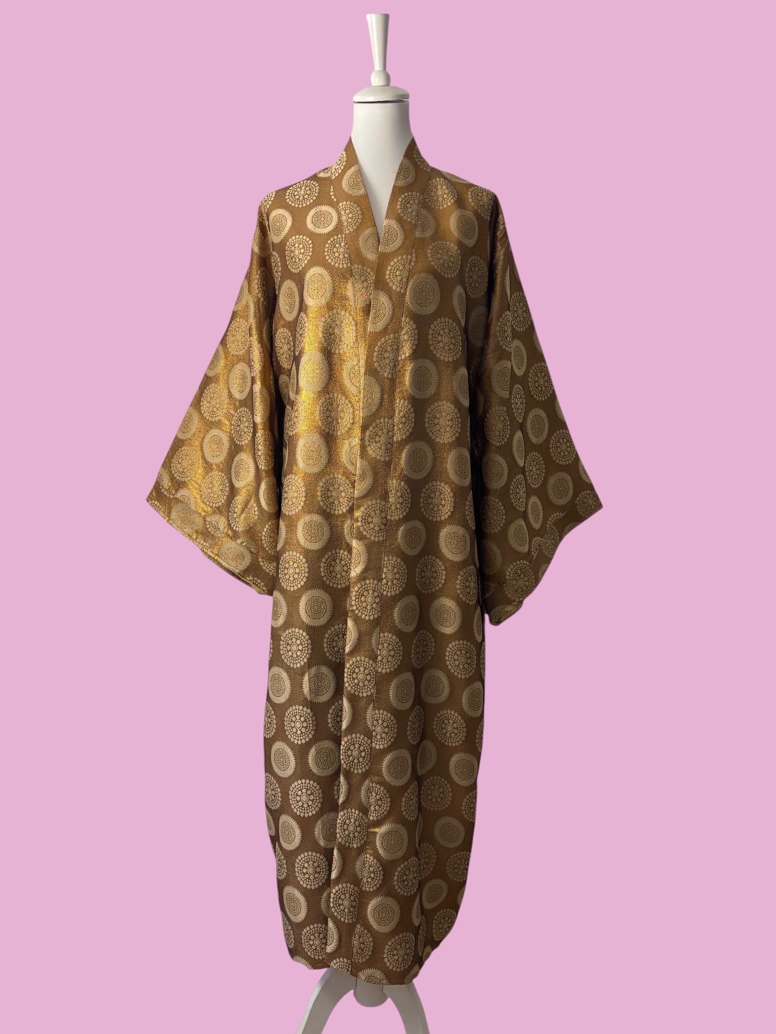 Avvolgiti nell’eleganza del Kimono Lux, un capo raffinato che unisce comfort e stile in un’unica silhouette senza tempo. Realizzato in un tessuto lucido della seta broccata color bronzo con motivi circolari dorati, questo kimono presenta una texture preziosa che cattura la luce e dona un aspetto lussuoso ad ogni movimento.