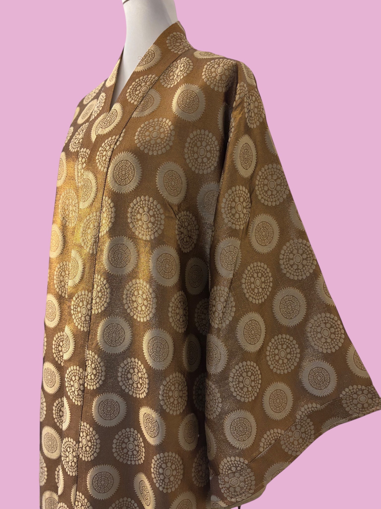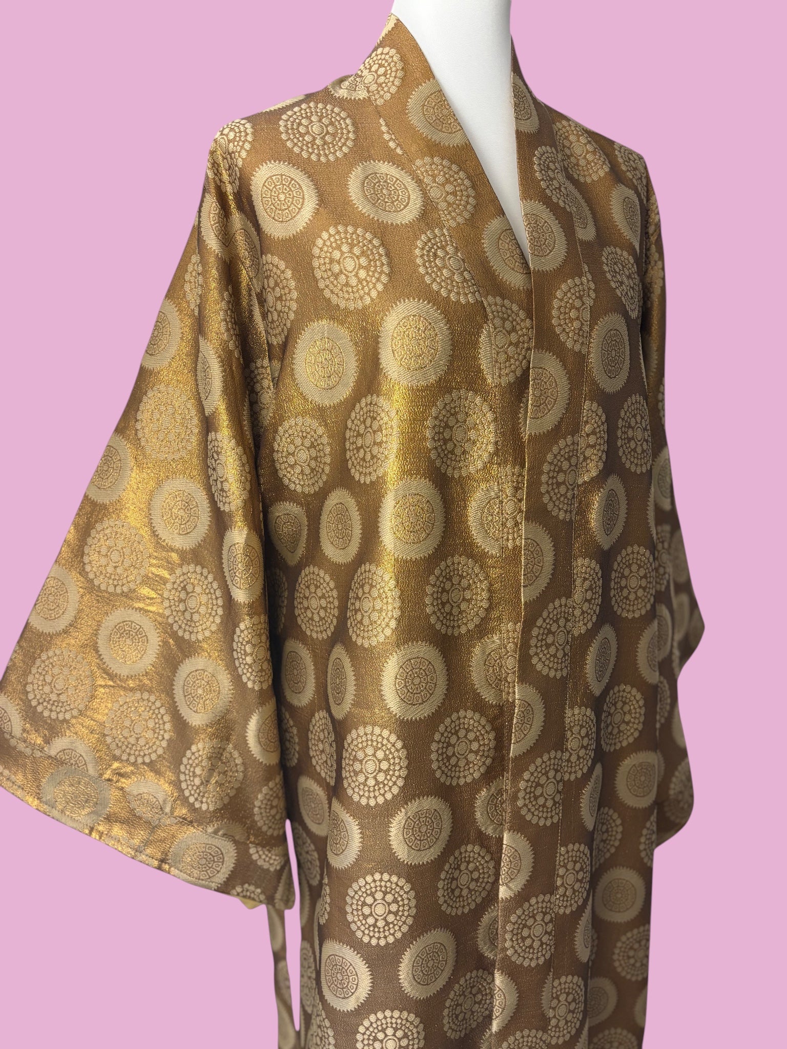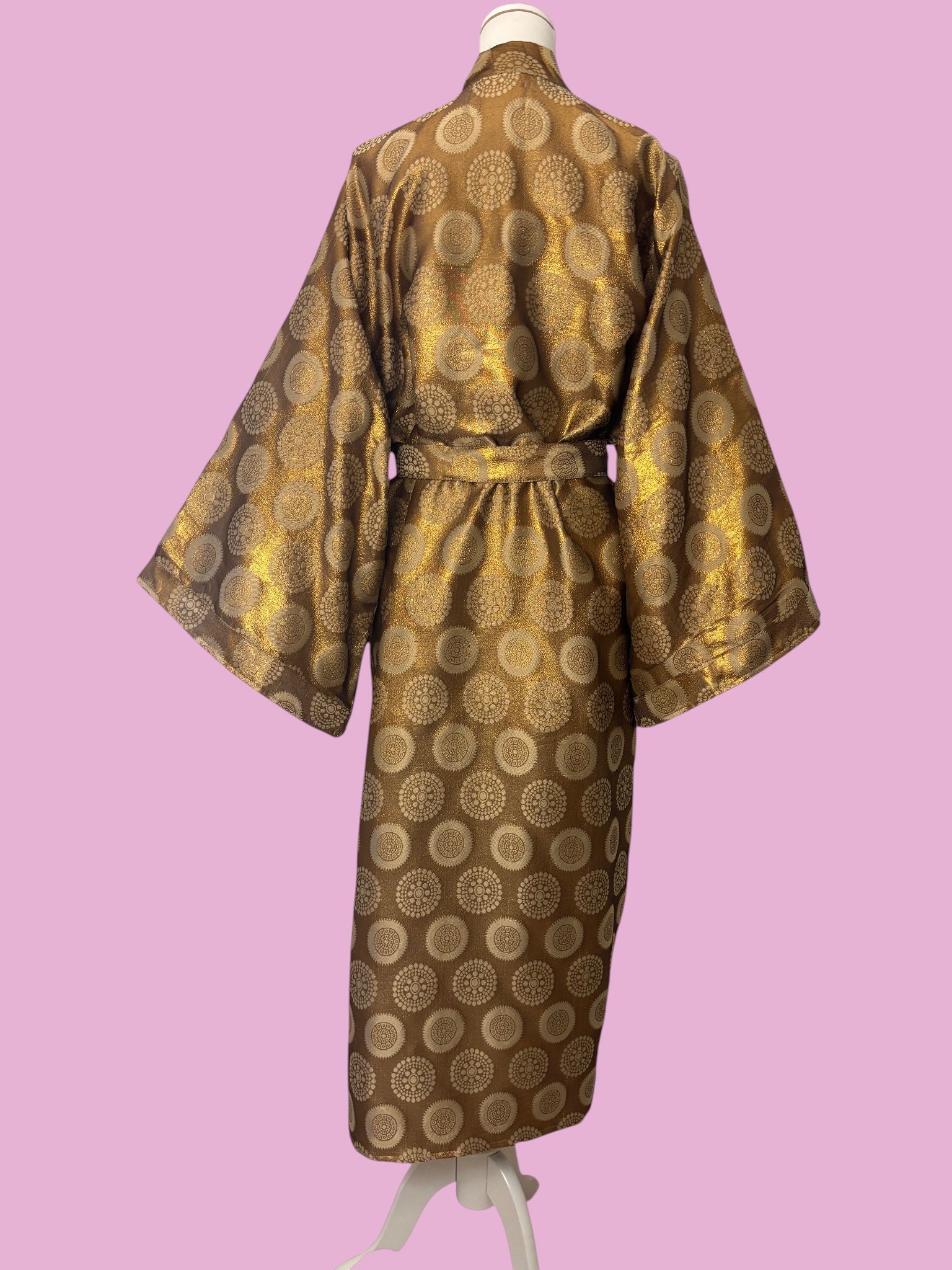 Avvolgiti nell’eleganza del Kimono Lux, un capo raffinato che unisce comfort e stile in un’unica silhouette senza tempo. Realizzato in un tessuto lucido della seta broccata color bronzo con motivi circolari dorati, questo kimono presenta una texture preziosa che cattura la luce e dona un aspetto lussuoso ad ogni movimento.