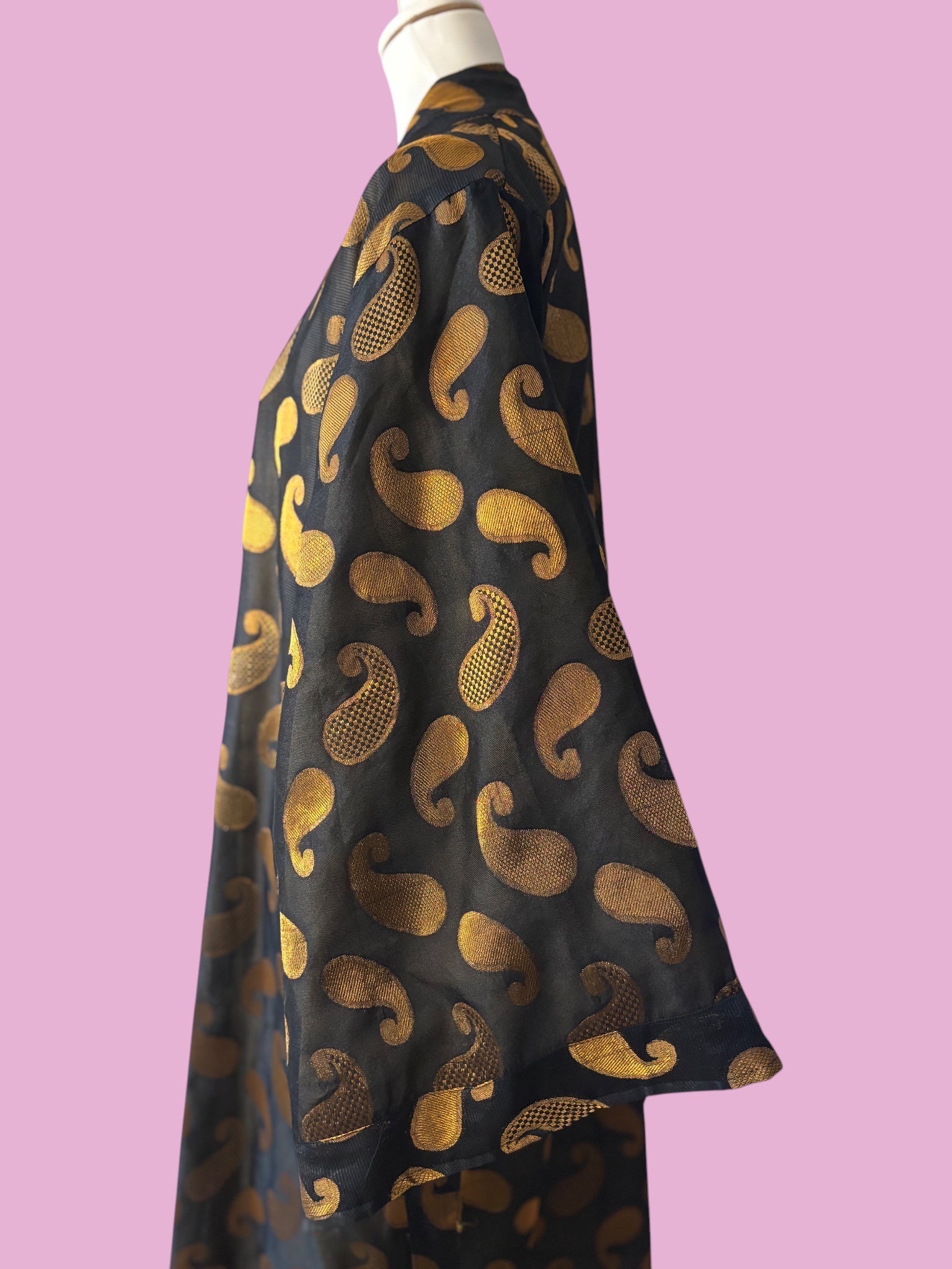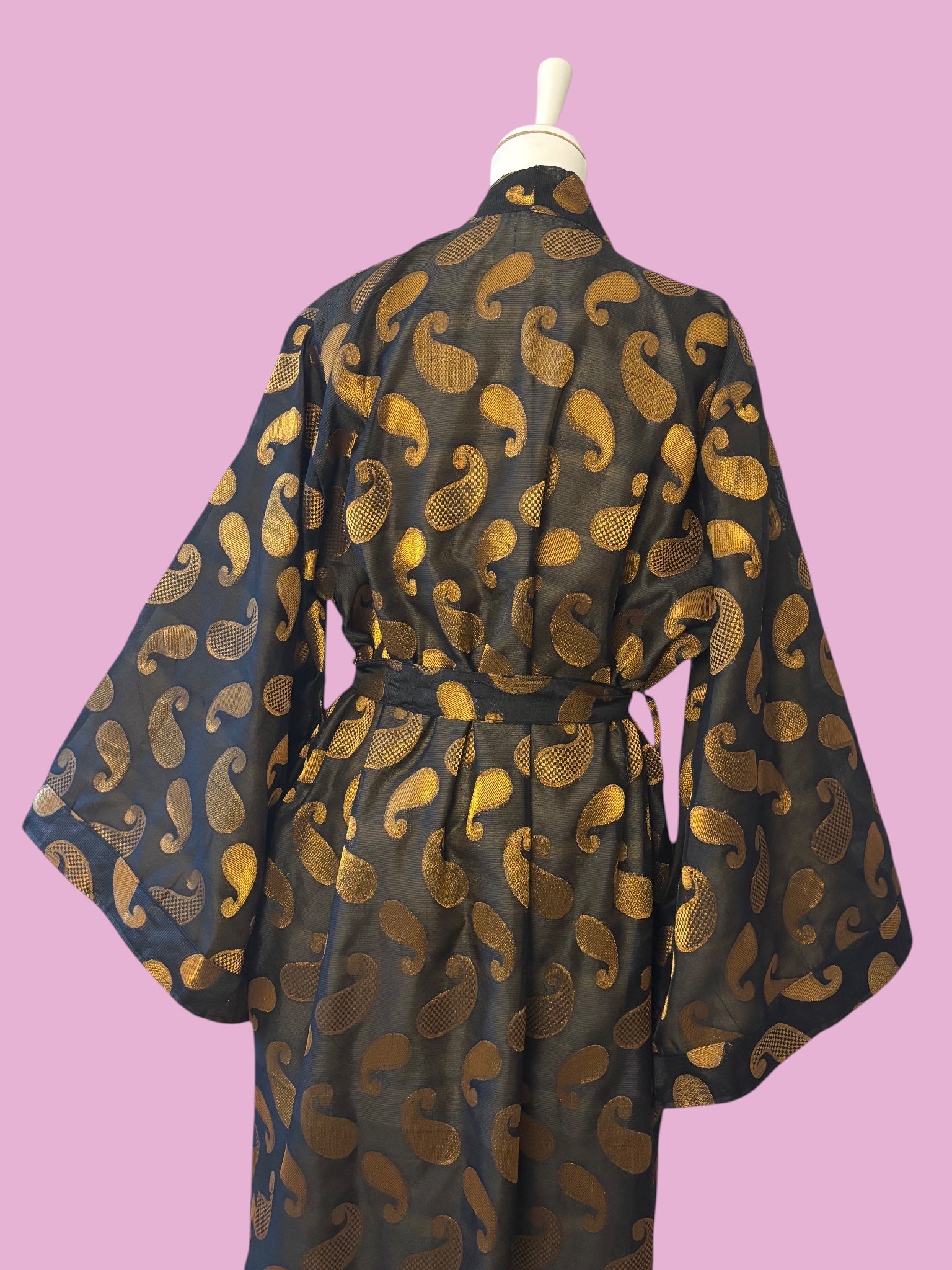 Un capo elegante e senza tempo, questo kimono in seta broccata nera impreziosito da motivi dorati offre un equilibrio perfetto tra stile moderno e tradizione artigianale. Il tessuto lucente presenta un pattern sinuoso in oro che cattura la luce a ogni movimento, rendendo il kimono un pezzo distintivo e raffinato.